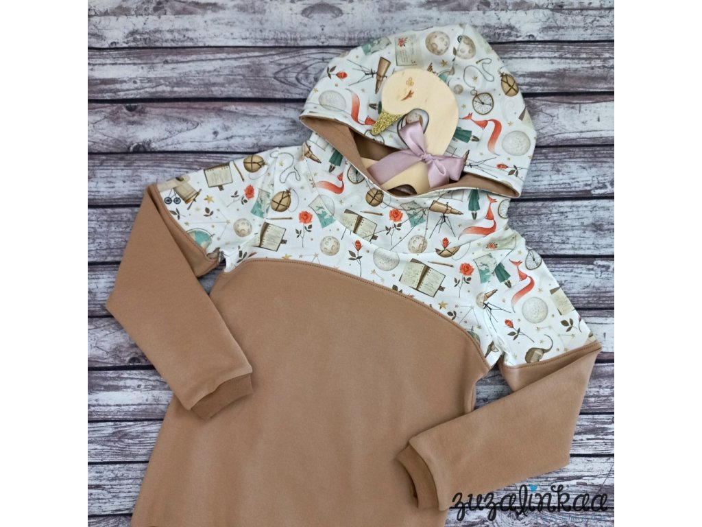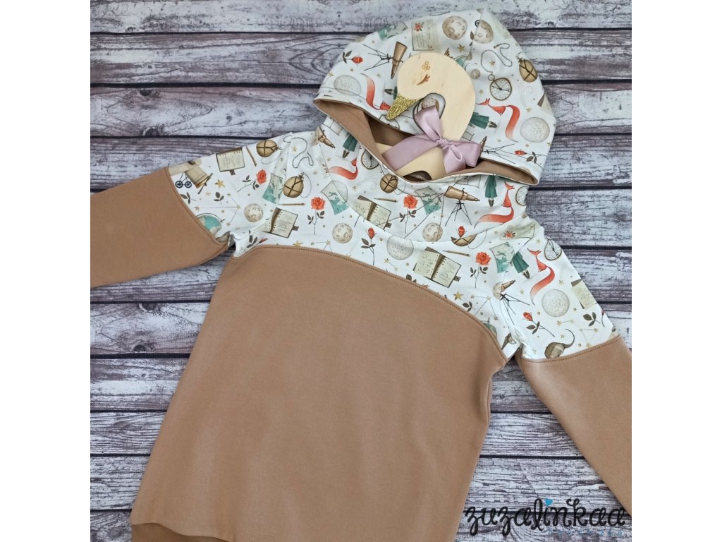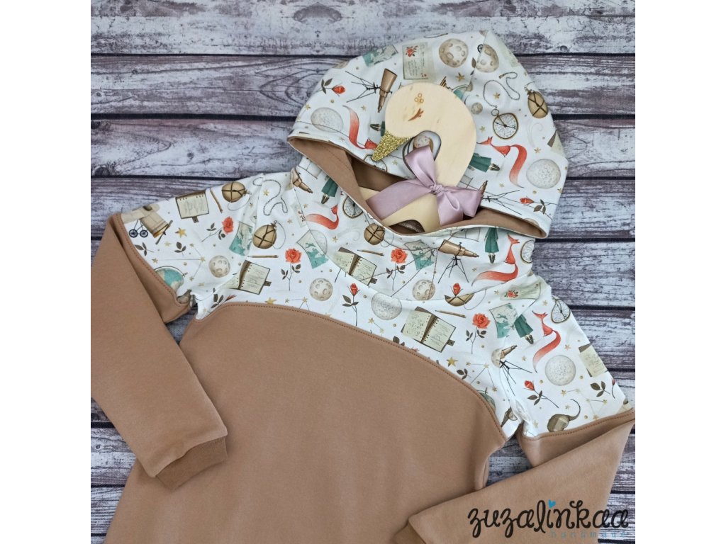 Dětská mikina z kvalitní designové teplákoviny s krásným potiskem na motivy Malého prince, v kombinaci se světle karamelovou teplákovinou, jemně pružný materiál